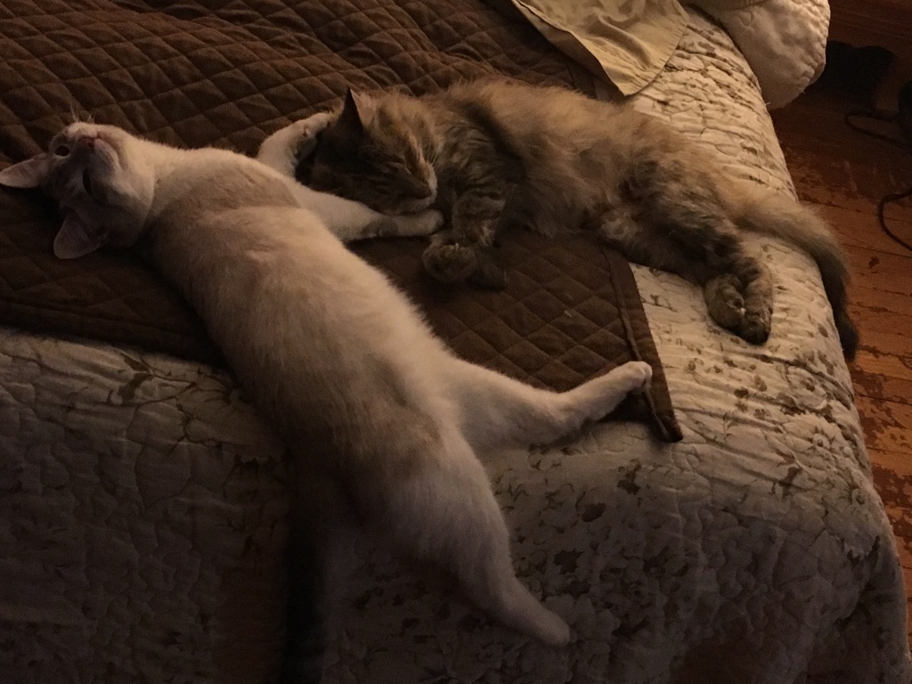 This is Heels in a typical cockamamee pose while Dolores is trying to rest. Five minutes peace, Heels; five minutes peace.